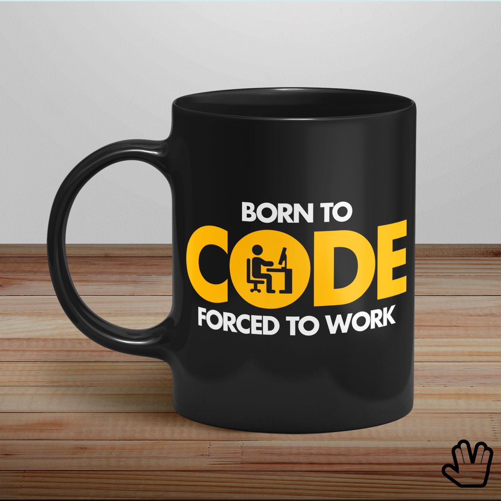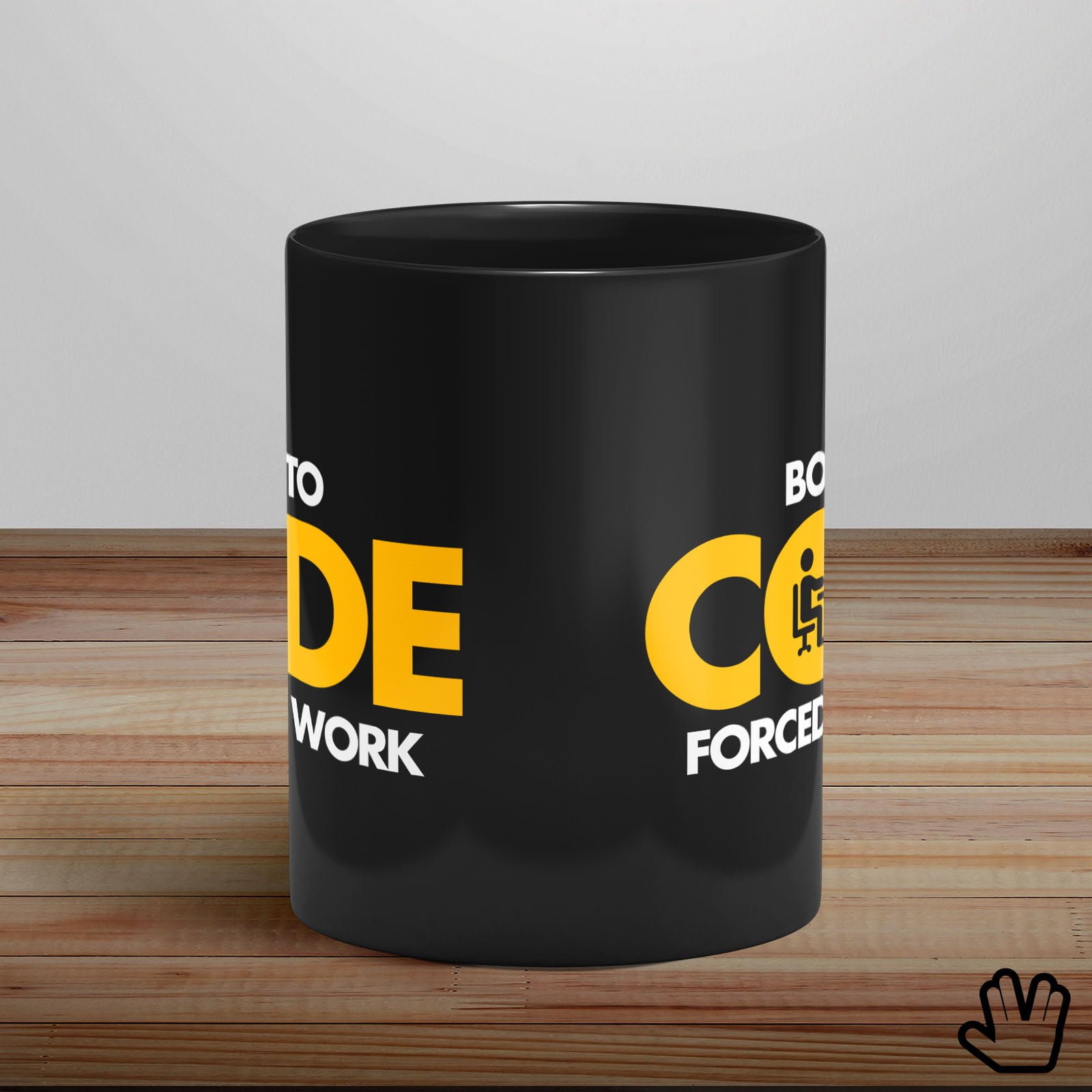 Caneca Born To CODE, Forced To WORK, produzidas em porcelana de alta resistência, são ótimas para os momentos de relaxamento ou durante o trabalho.
