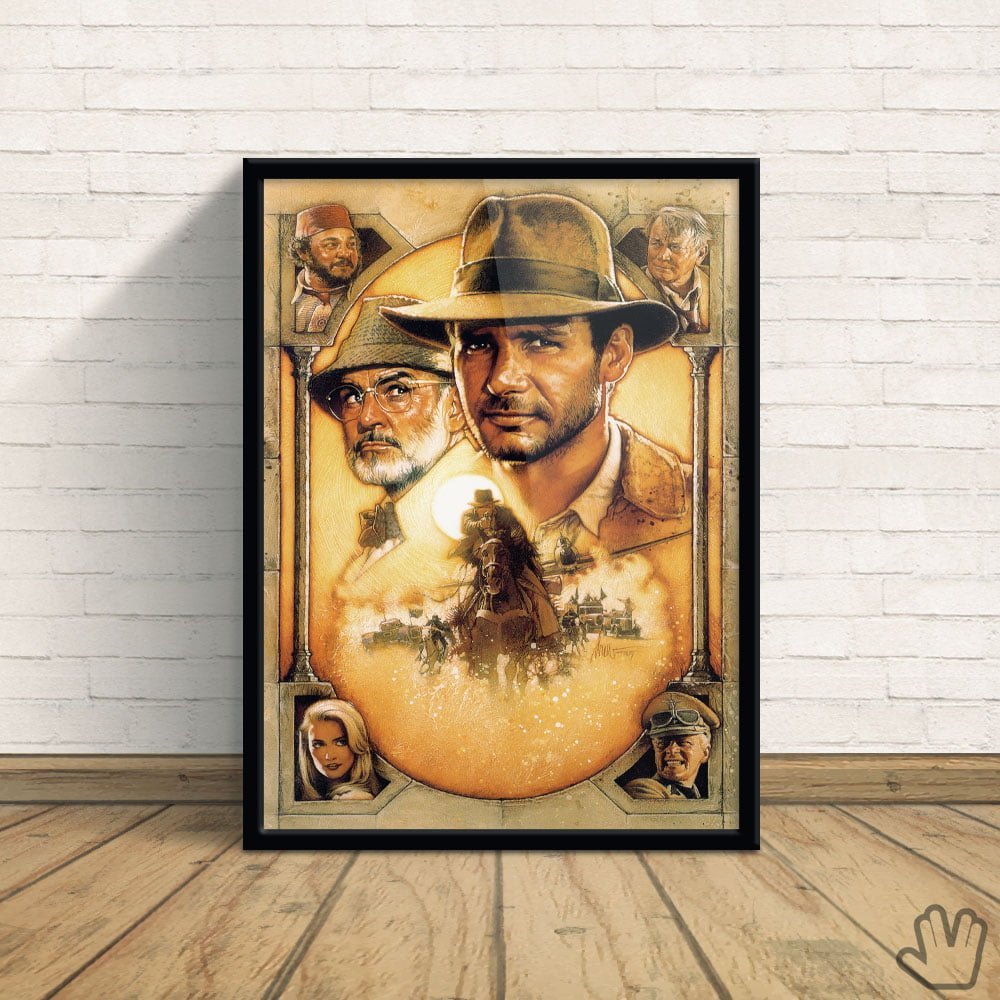 Quadro Indiana Jones E A Última Cruzada, no filme, ambientado em 1912, um jovem escoteiro chamado Indiana Jones encontra a Cruz de Coronado durante uma de suas expedições e tenta roubá-la, mas é derrotado por um colecionador disfarçado de policial. Anos depois, já como professor de arqueologia, ele consegue a cruz novamente em um navio, enfrentando homens perigosos. Recebe então um diário de seu pai com a localização do Santo Graal, que os nazistas também buscam. Com a ajuda da Dra. Elsa Schneider, Indiana resgata seu pai e foge com amigos para tentar alcançar o Graal antes dos Nazistas.